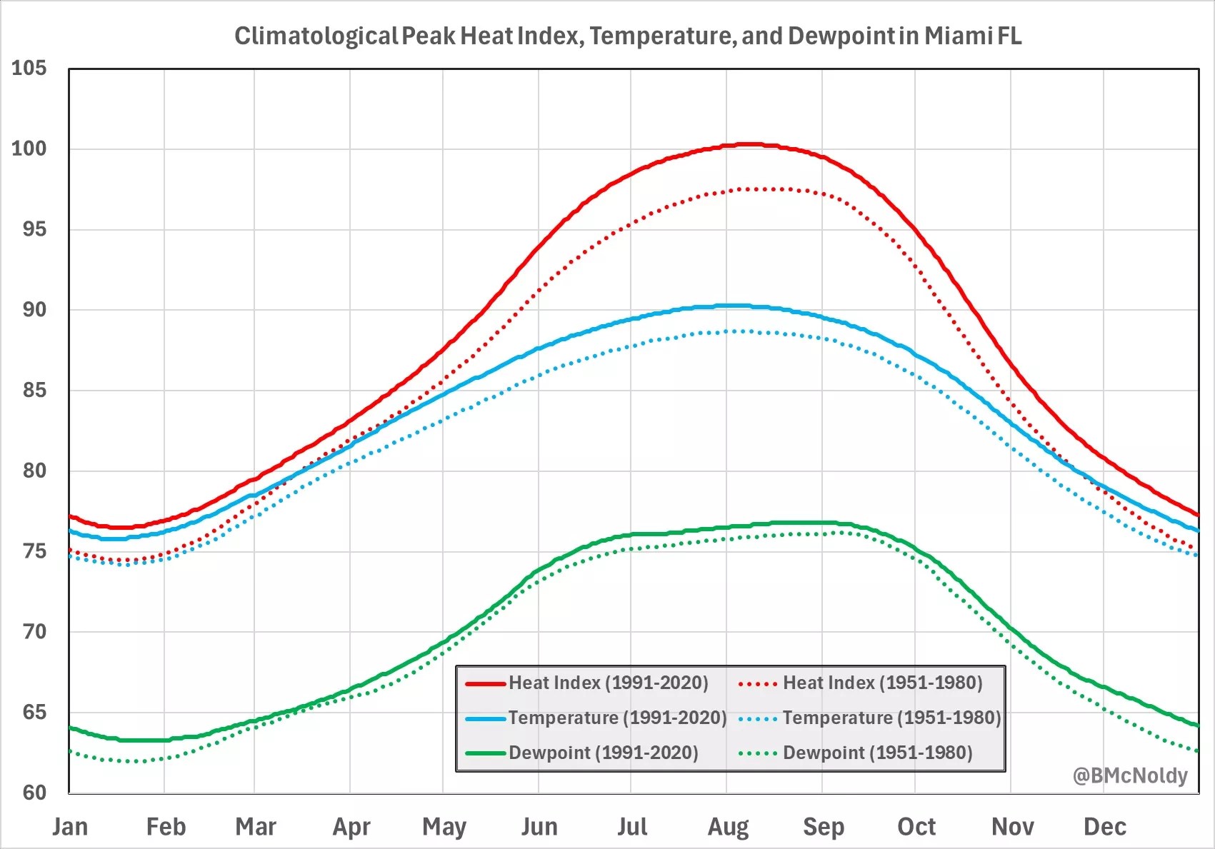 Based on McNoldy’s tweeted chart (embedded below this paragraph) for Miami’s climatological peak heat index, temperature, and dew point from 1991 to 2020, the peak heat index begins to fall below 100 degrees at the beginning of September and reaches 95 degrees by October. The average daily high temperature, which peaked at 90 degrees in August, gradually decreases through September, eventually sinking to 85 degrees on October 19.