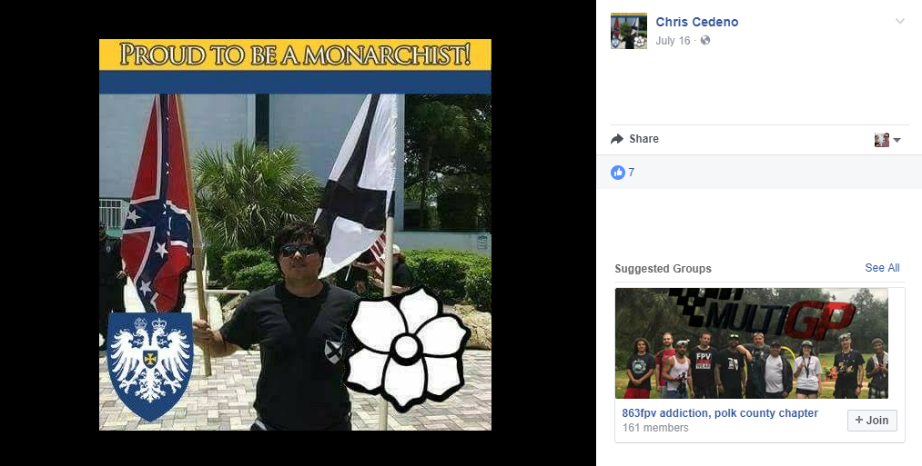Monzon showed up at the protest in a shirt emblazoned with the logo for the Florida League of the South, a white nationalist group that wants the Confederate states to secede from the Union again and create a society led by white, Christian people of European descent.