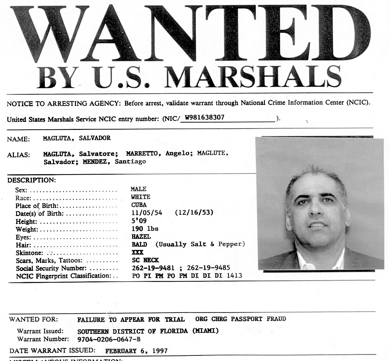 On February 6, halfway through his passport-fraud trial, Magluta walked out of the federal courthouse, telling a guard that he needed to get something from his car. Because Magluta was not in custody, he was free to come and go from the courthouse. But by midmorning, when he had not returned, Judge Lenard issued a warrant for his arrest.