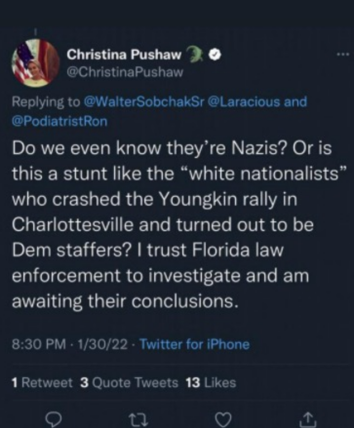 We can appreciate Ron DeSantis and his press secretary, Christina Pushaw, not wanting to jump to conclusions or misrepresent facts. Despite the swastikas and slurs, Pushaw didn’t seem convinced and asked, in a since-deleted tweet on Sunday night, “Do we even know they’re Nazis?”