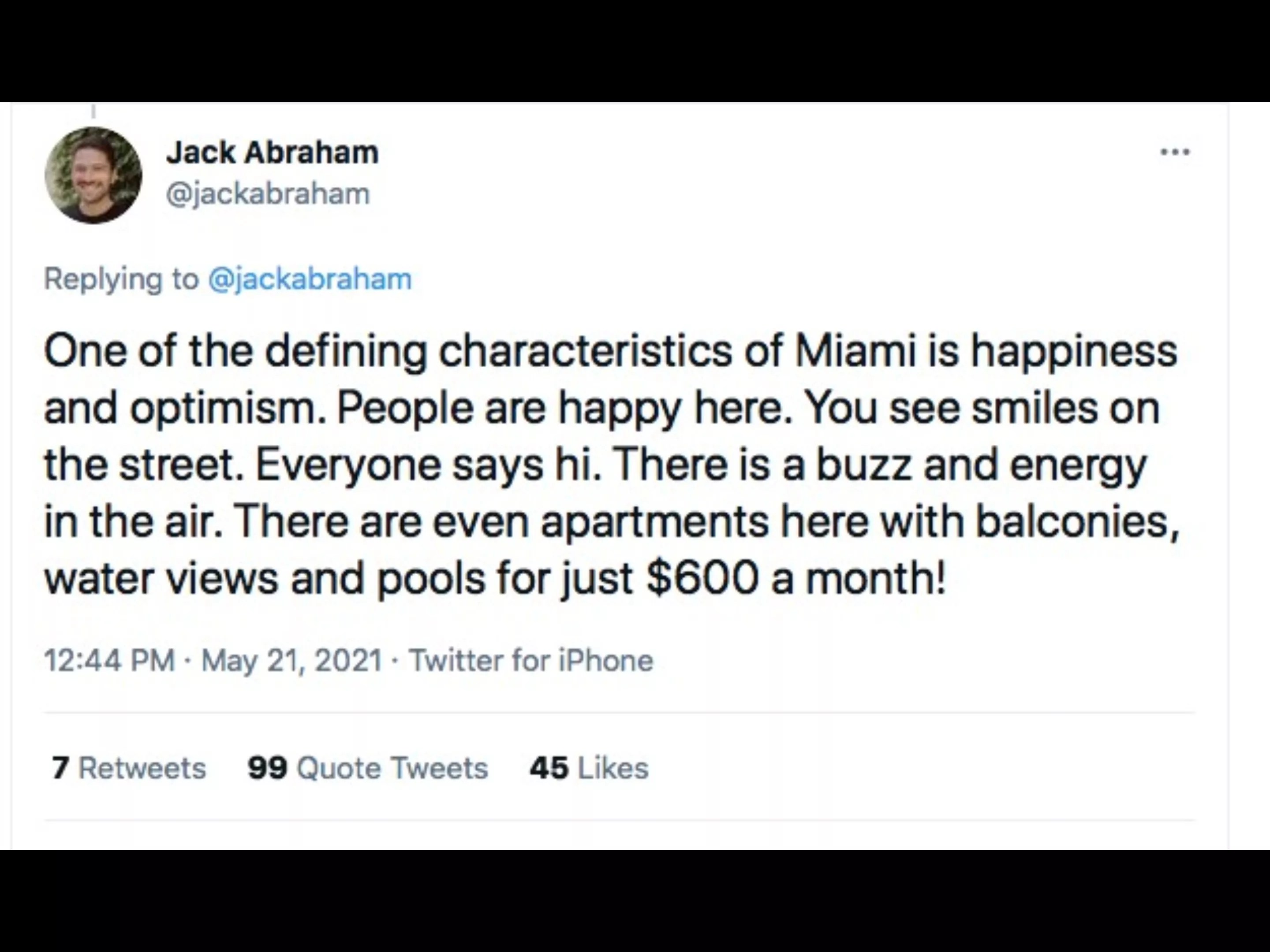 Most recently, entrepreneur and investor Jack Abraham, who moved to Miami last year, tweeted about how great the city is.