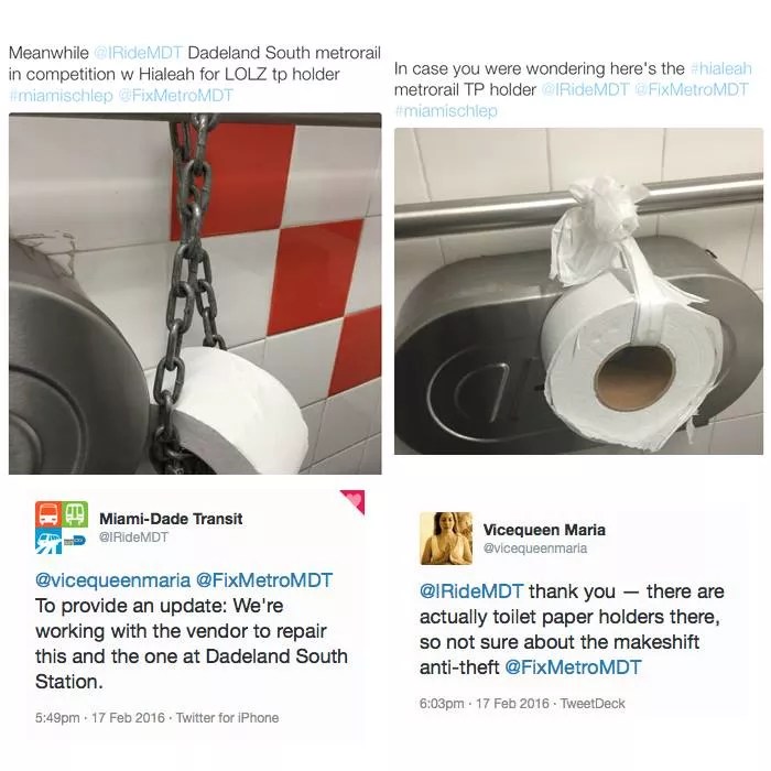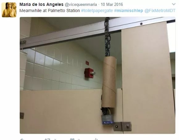 I got an answer only for the first question. He said transit wouldn’t allow him to put toilet paper in the stall until it had a proper toilet paper holder. “I’ll get fired,” he said. “Please don’t use my name.” The rest he chalked up to “only in Miami.”