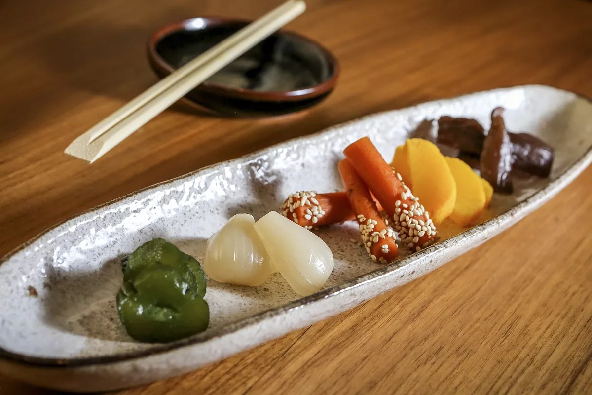 There’s also a lengthy list of hot offerings that includes matzo-crusted fried chicken, which earned a cult following in New York. The desiccated crackers, in combination with egg whites and a Japanese chili spice, create a crust that is more about texture than flavor. It fuses with the skin and creates a superlight, crunchy exterior that complements the juicy flesh inside. An accompanying dish of wasabi-spiked honey is a smart analog for the hot sauce and honey that are often drizzled over Southern-style fried chicken. Oshinko Photo by CandaceWest.com