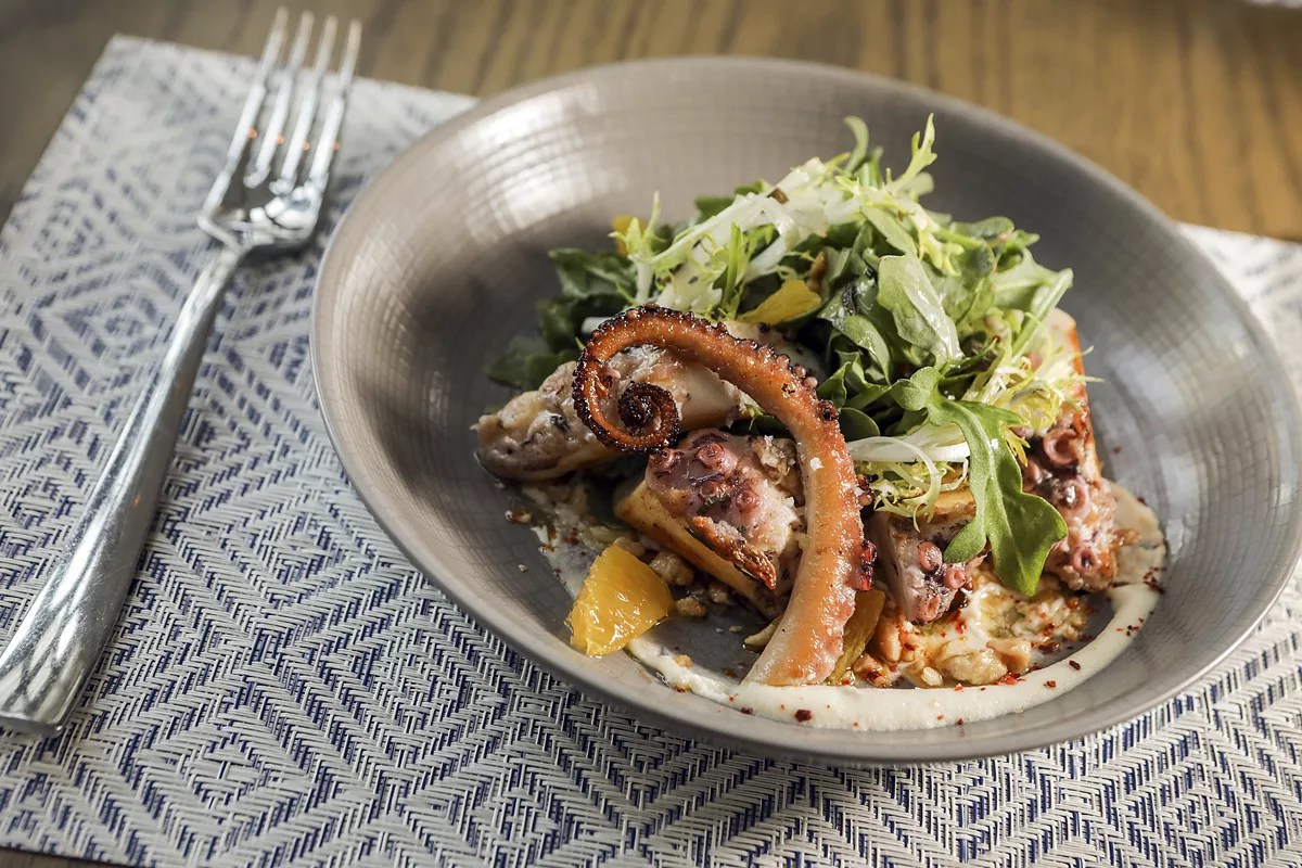 First, you’ll nibble on a complimentary platter of doughy, house-baked focaccia served with olive oil. Then request the mezze platter ($15). In the center, two lightly fried herb falafel and a handful of crisp crackers come ready to plunge into a spicy Moroccan hummus and an eggplant baba ghanouj. Each creamy dip is crowned with a tablespoon of olive oil that is best stirred before digging in. Consider an order of barbajuans, a French Rivera-influenced fritter stuffed with short rib and Swiss chard. Small enough to consume whole, the warm turnover pastries are served in groups of five with a dash of Parmesan and cracked pepper ($15). Octopus à la plancha Photo by CandaceWest.com
