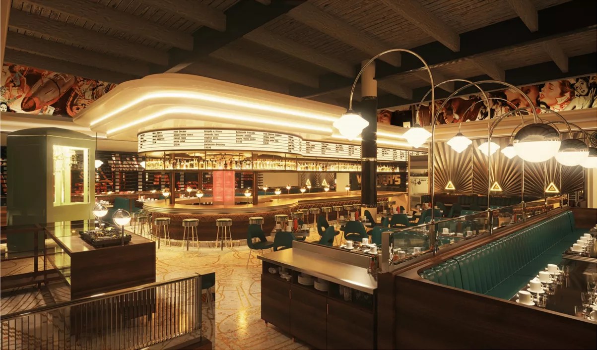 At Winker’s Diner, the American classic receives a whimsical facelift. The 240-seat diner, decorated in teal-colored Pullman-style booths and stainless steel-rimmed wood tabletops, will replace the jukebox of yesteryear with a more Grutman-appropriate DJ booth.