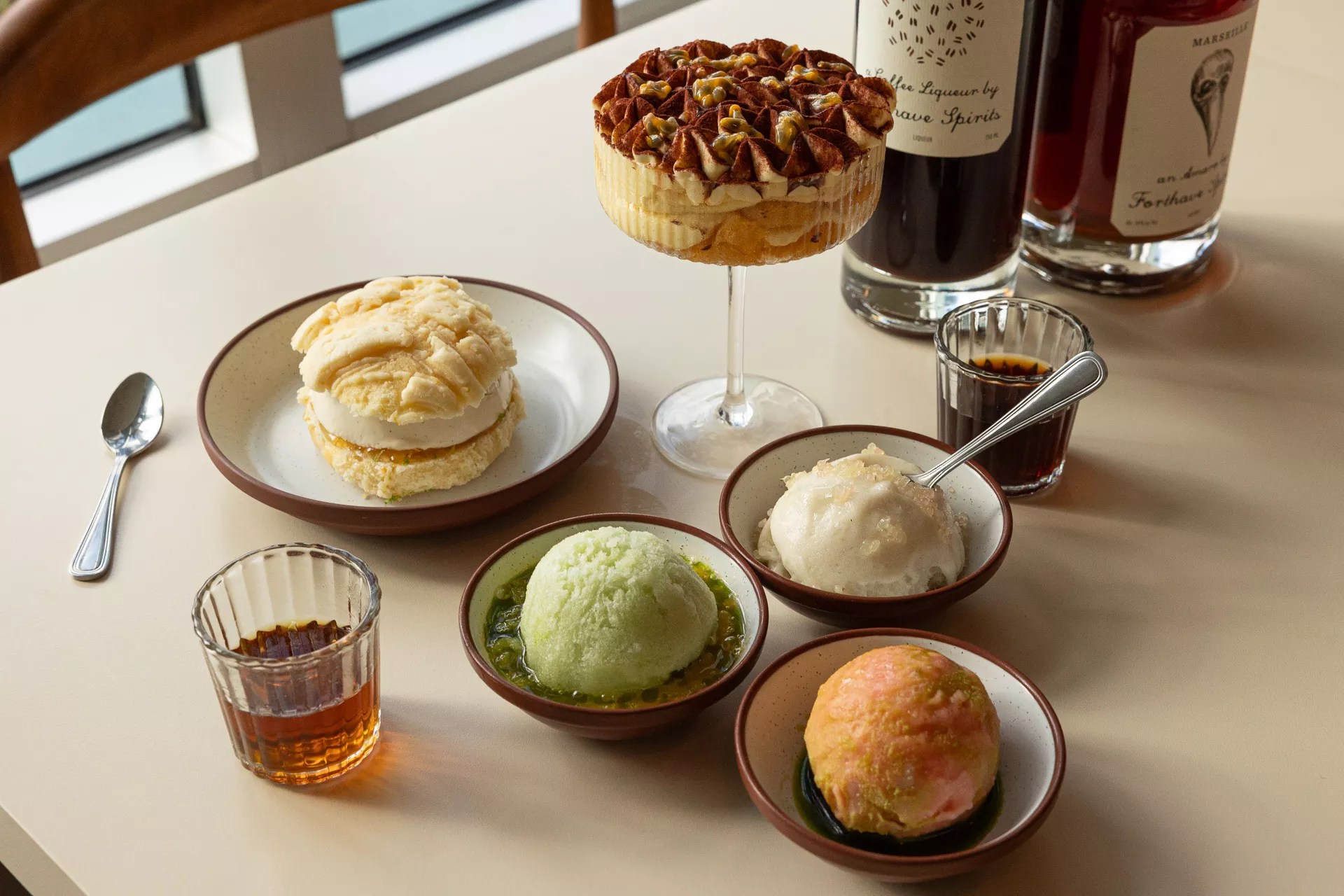 Ensenada served ice cream flavors like guava, heirloom tomato, soursop, and lemon verbena, alongside specialties like a carajillo affogato and a concha ice cream sandwich