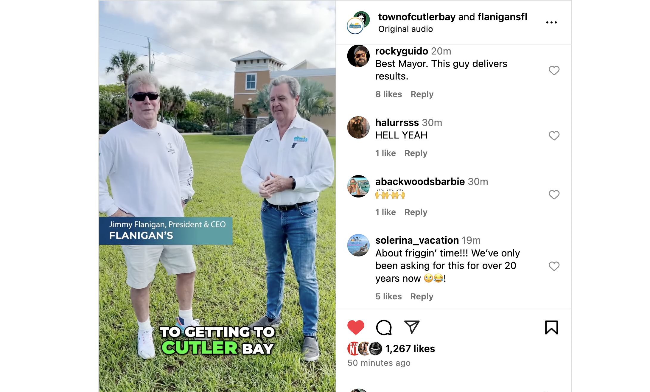 Screenshot via Instagram/@townofcutlerbay and @flanigansfl
