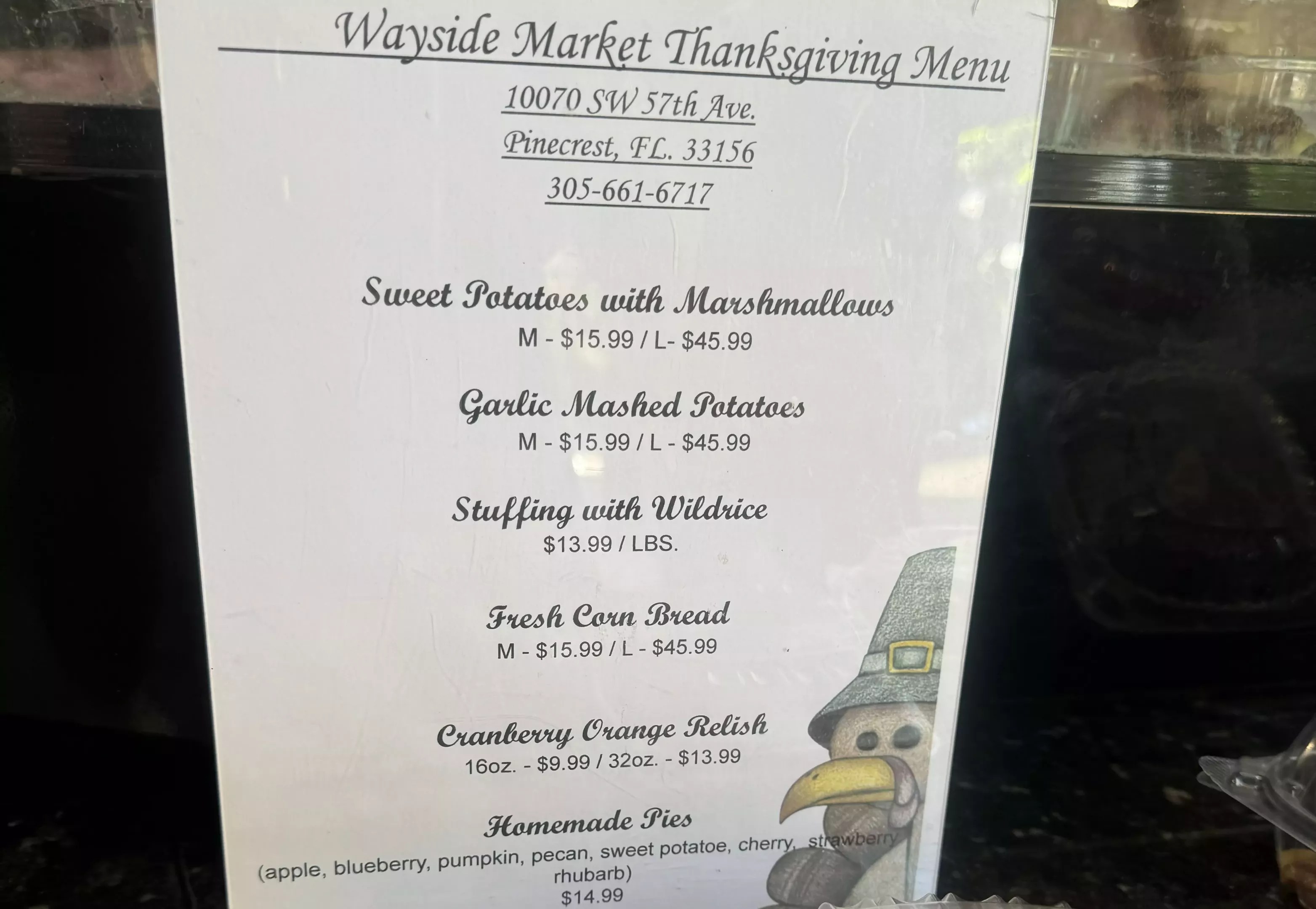 The Thanksgiving catering menu at Pinecrest Wayside Market