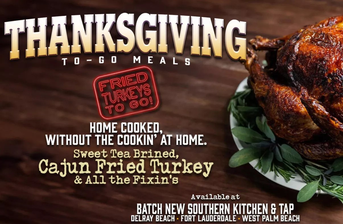 batchsouthernkitchen.com/friedturkeytogoBatch’s “Thanksgiving To-Go,” featuring a Cajun-fried turkey, can be ordered for pick up on Thanksgiving Day from 10 a.m. to 3:30 p.m. at Batch New Southern in Fort Lauderdale. There are two options available: The “Full Bird” ($270, serves eight to ten people) includes a whole sweet tea brined, Cajun-fried turkey served with all the fixings (buttermilk mashed potatoes, gruyere and sage stuffing, green bean casserole, sweet potato casserole, gravy, cranberry sauce, and bake-at-home biscuits with honey butter). The “Half Bird” is a half sweet tea-brined, Cajun-fried turkey served platter style (including a breast, thigh, leg, and wing). It’s served with all the fixings mentioned earlier ($185 and serves four to six people). Additional sides are available Á  la carte at $30 each. Place your order online at batchsouthernkitchen.com/friedturkeytogo.