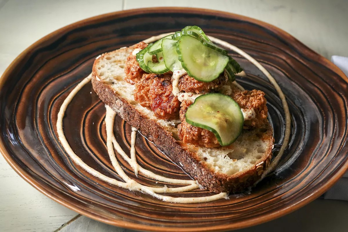 Richard Hales’ restaurant at the Confidante, Bird & Bone, is the definitive local spot for a plate of Nashville hot chicken. Hales’ version is far less aggressive than those found at Southern institutions such as Prince’s Hot Chicken Shack. He separates whole birds from their carcasses and then brines them in a simple salt solution that leaves every fiber, even those in the breast, as juicy as ripe mango flesh. The meat is seasoned with a blend of cayenne pepper, hot paprika, ground mustard, and garlic. The chicken is then placed on a bed of Zak the Baker bread, drizzled with Chinese hot mustard and local honey, and finished with slices of housemade pickles. While you enjoy the crunchy shell and moist and tender interior, the heat creeps up on you; it’s a subtle tingle on the lips rather than a death-defying experience. A whole bird costs $28 and is served with Florida honey, hot mustard, bread, and pickles.