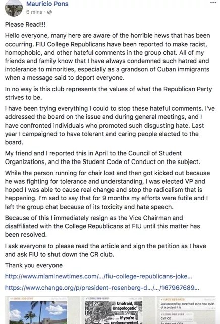 “I was elected VP and hoped I was able to cause real change and stop the radicalism that is happening,” writes Mauricio Pons, who says he’s the grandson of Cuban immigrants and was particularly disturbed by the College Republicans’ xenophobic tenor. “I’m sad to say that for nine months my efforts were futile and I left the group chat because of its toxicity and hate speech.”